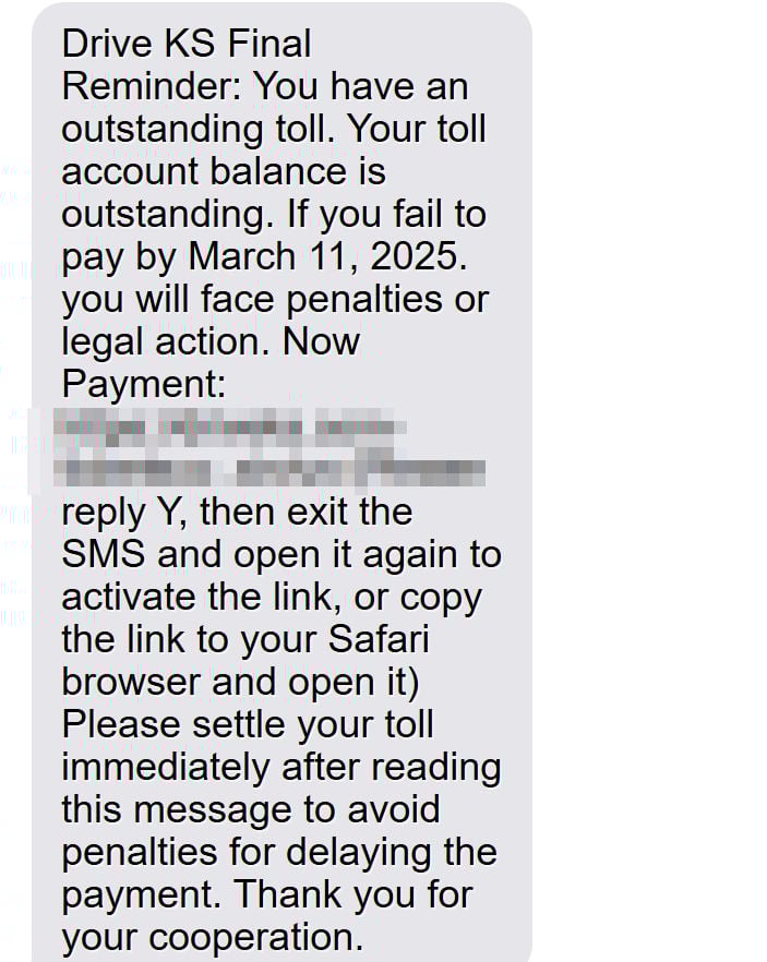 In recent years, a new phone number has been making the rounds, and it’s not a phone number you want to receive a call from. The number is associated with a company called Drive KS, which has been targeting unsuspecting drivers with a seemingly legitimate offer – an “Outstanding Toll” text scam.