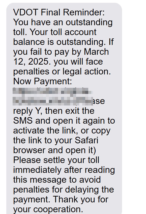 Here’s how the scam works: The scammers are using the VDOT’s logo, and convincing-looking messages to convince victims that they are legitimate. They are targeting frequent toll road users and targeting specific vehicle license plates. So, people who use toll roads in the state of Virginia are at higher risk of falling victim to this scam.